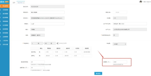 【应用场景】如部分产品保质期大于默认值720天,可进行手动修改,方便系统进行批次保质期管理。