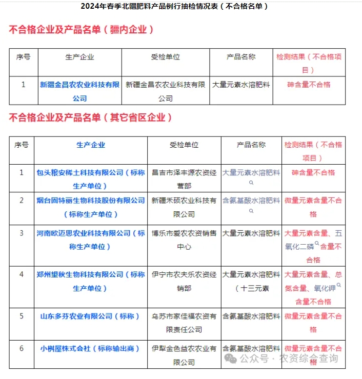 2024年春季北疆肥料产品例行抽检情况表(不合格名单)