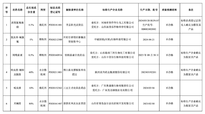 据悉,本次共抽检农药样品915个。经检测,合格样品909个,合格率99.3%;不合格样品6个(见附件1),其中假农药(未检出标签标注的有效成分或检出其他农药成分)3个,占抽检样品总数的0.3%,占不合格样品数的50.0%。