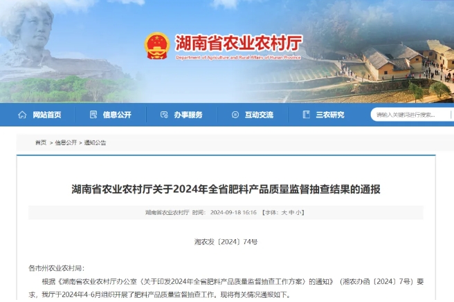 根据《湖南省农业农村厅办公室〈关于印发2024年全省肥料产品质量监督抽查工作方案〉的通知》(湘农办函〔2024〕7号)要求,我厅于2024年4-6月组织开展了肥料产品质量监督抽查工作。现将有关情况通报如下。