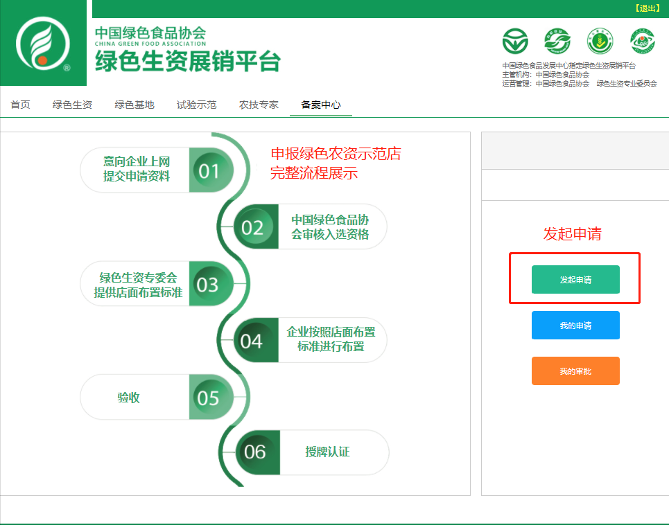 二、输入手机号、获取验证码——进入绿色生资示范门店备案系统;发起申请——填写审核资料;