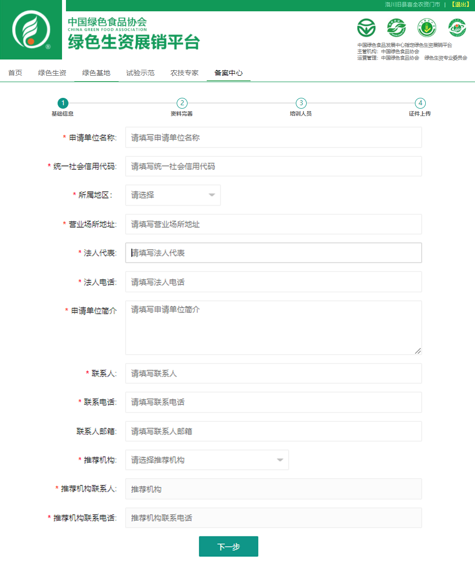 1、经营者基础信息:申请单位名称、统一社会信用代码、所属地区、营业场所地址、法人代表与联系方式、申请单位简介、联系人与联系方式、推荐机构、推荐人与联系方式 |