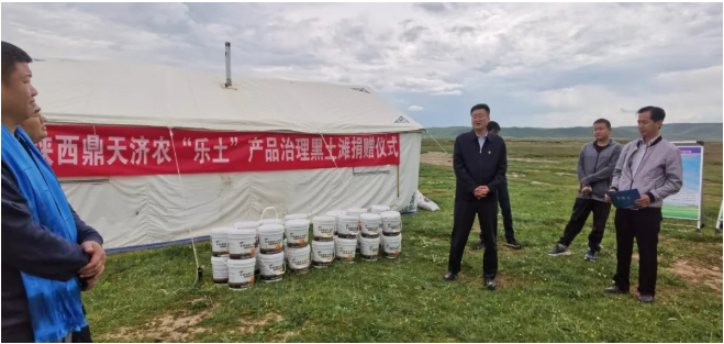 县自然资源局李局长、张副局长就当地草原牧场“黑土滩”生态问题的治理成果及草原生态保护等工作向考察人员进行了交流汇报。珍佰农公司副总裁庞国平就集团公司整体业务及相关产业、产品进行了简单介绍。济农公司市场服务总监黄智,就济农公司立足土壤面向作物的产品定位及济农乐土高含量腐殖酸产品特点进行了详细汇报,并提出向河南县自然资源局捐赠部分绿色生资产品——济农乐土,用于草原牧场“黑土滩”生态问题的治理。河南县自然资源局李局长与西安鼎天投资控股(集团)有限公司副总裁高虎,代表双方在现场举行了绿色生资济农乐土高含量腐殖酸产品的捐赠仪式。